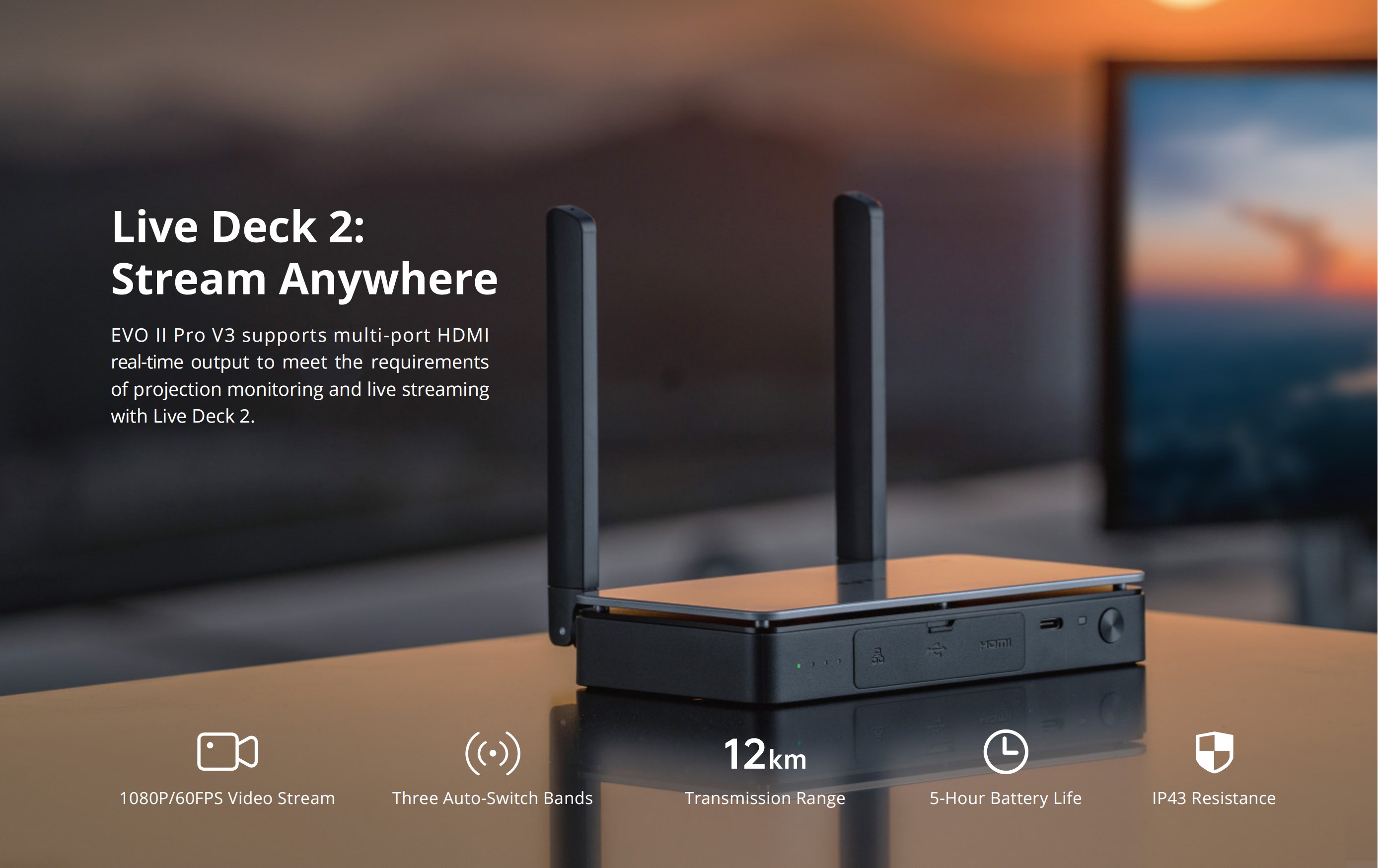 EVO II Pro V3 supports multi-port HDMI real-time output to meet the requirements of projection monitoring and live streaming with Live Deck 2.