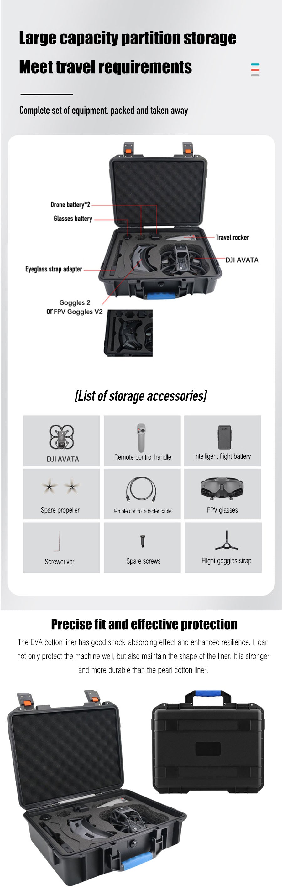 1. Precise fit and effective protection: This DJI Avata storage bag using EVA cotton lining has good shock absorption and enhanced resilience, which can protect the machine well and maintain the shape of the lining. It is stronger and more durable than pearl cotton lining.