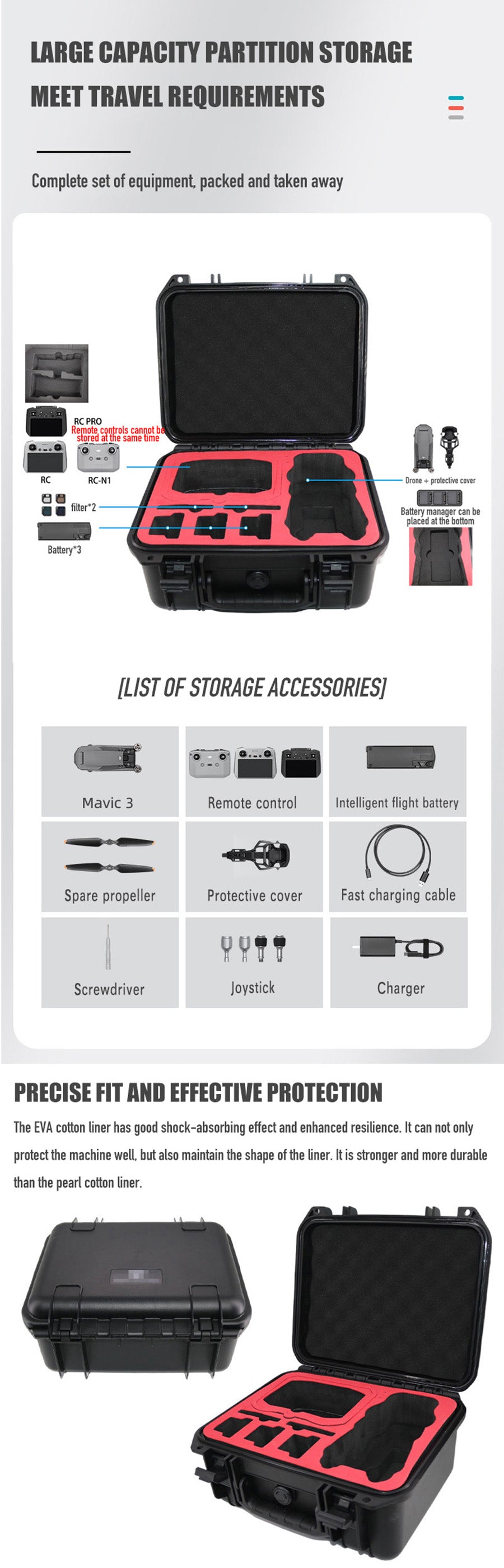 1. Simple design and quality: This DJI Mavic3 Classic storage bag Made of high-quality ABS material shell, one-piece molding, pressure-resistant and wear-resistant, simple and exquisite, more practical and convenient