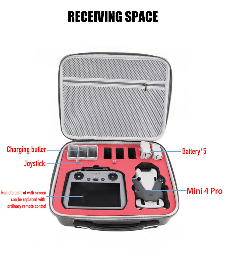 1. Simple design and quality: This DJI Mini4 Pro Storage bag Made of high-quality PC plastic shell, anti-collision and waterproof, one-piece molding, pressure-resistant and wear-resistant, simple and exquisite, more practical and convenient