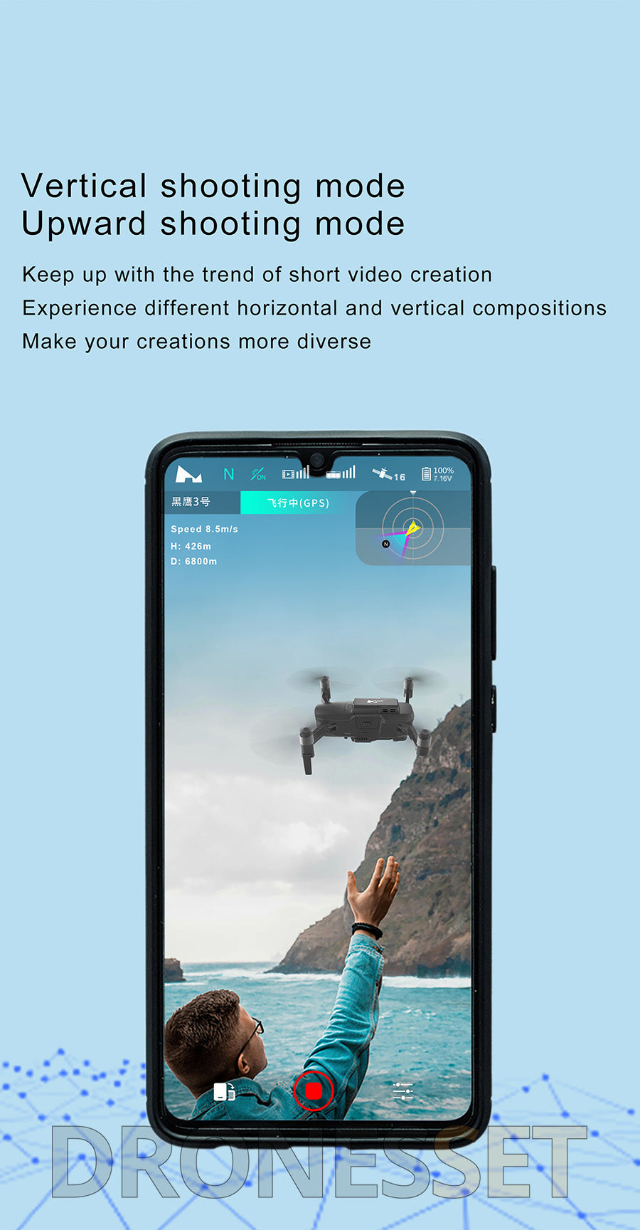 Maximum horizontal flight speed: Movie mode:3m/s(S, No wind at sea level); Normal mode:10m/s(N, No wind at sea level); Sports mode:16m/s(S, No wind at sea level)