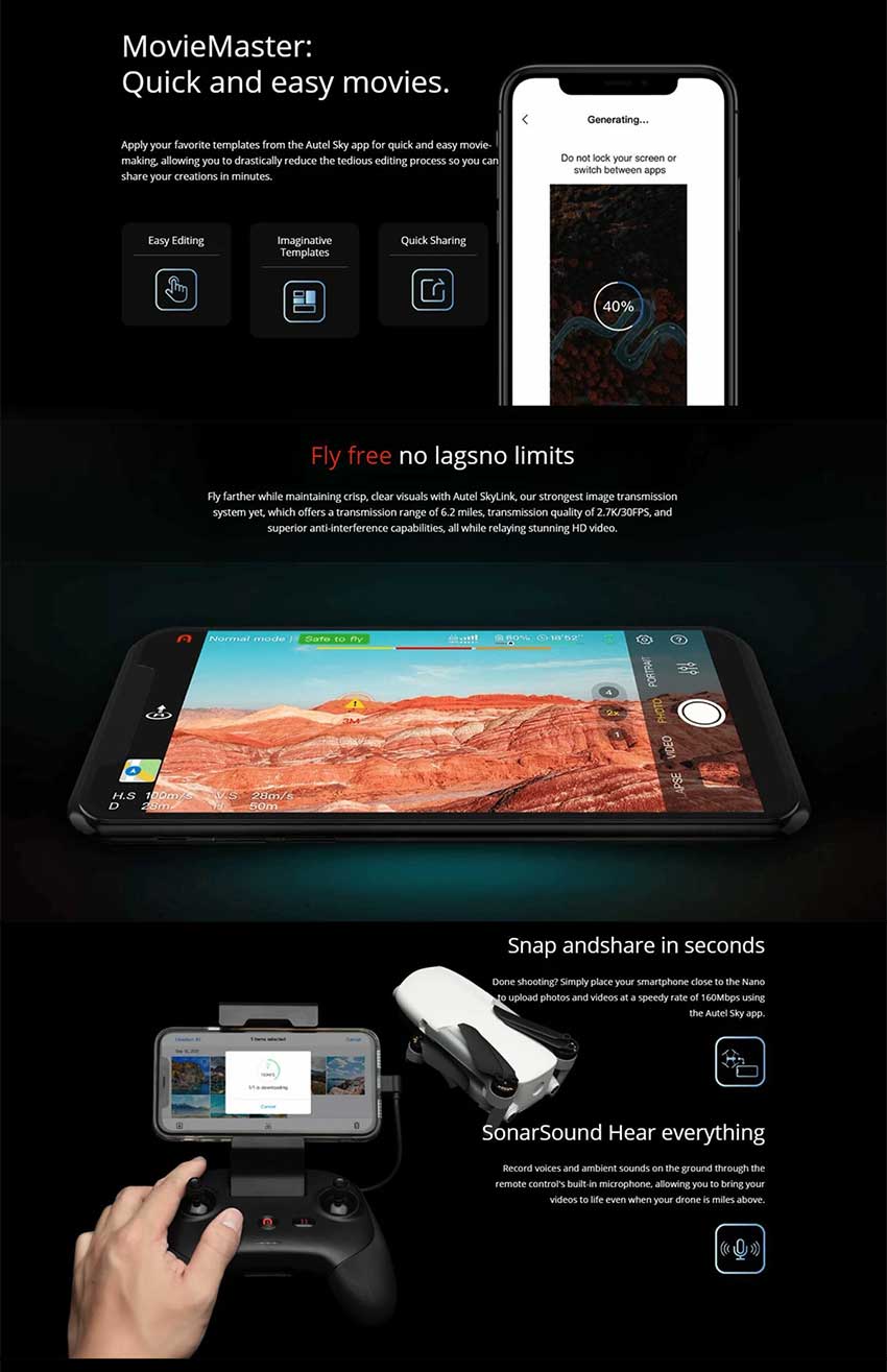 Autel EVO Nano+ Effective image transmission range up to 10KM (6.2Miles).