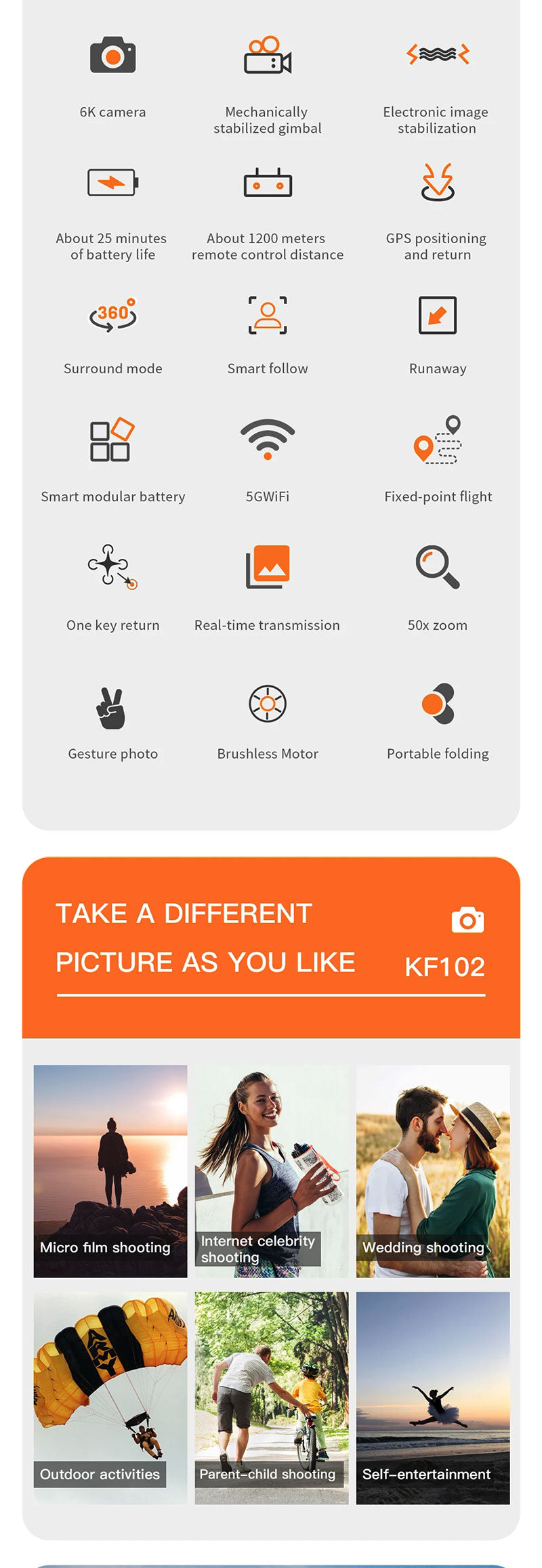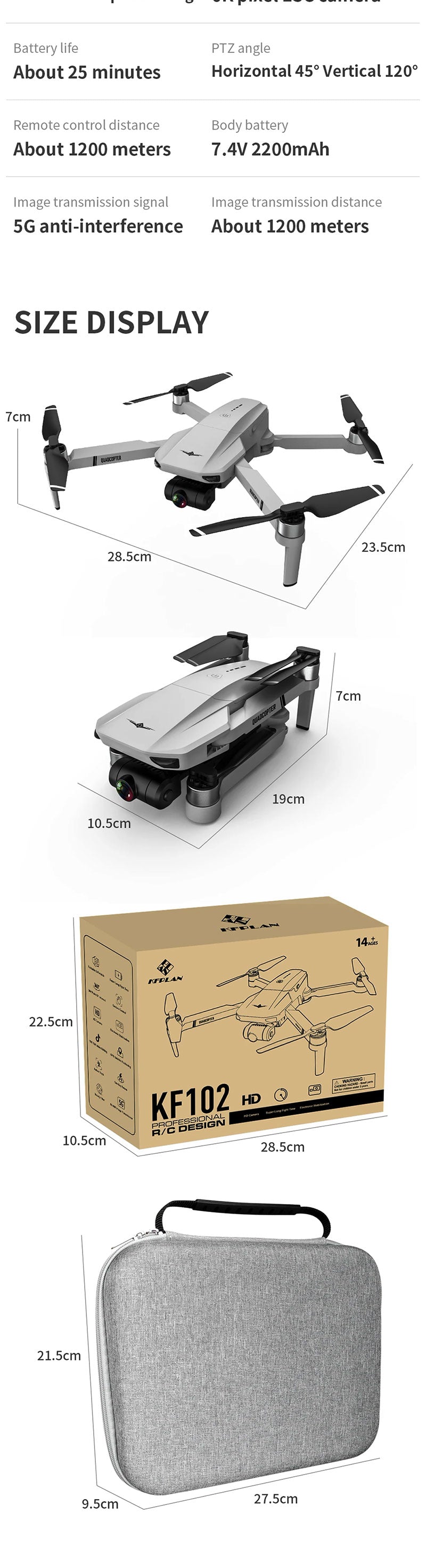 • KF102 Package Includes: Batteries, Operating Instructions, Charger, Remote Controller, Camera, USB Cable