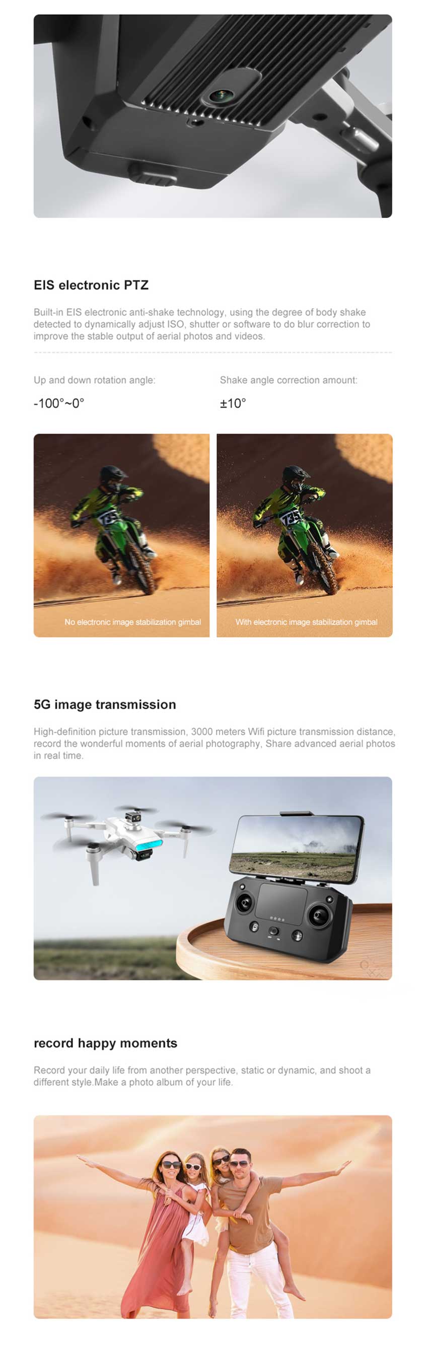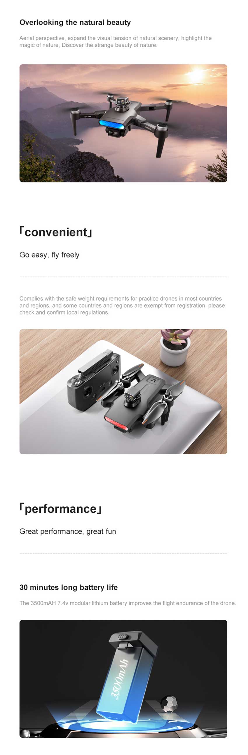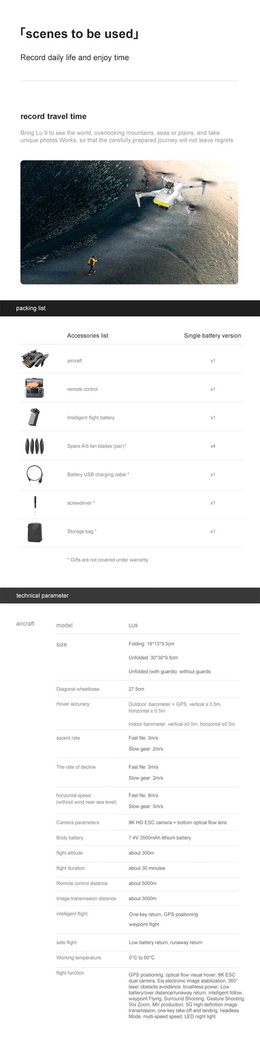 • Product features: 8K pixels, equipped with an electrically adjustable 90-degree camera, dual-mode GPS positioning and optical flow positioning, 360° omnidirectional obstacle avoidance, 64-color ambient light gradient, dual-camera switching, ultra-long flight, six Pass-band gyroscope, ascending and descending, forward and backward, left and right side flight, steering, one-key return, headless mode, one-key geomagnetic calibration, one-key horizontal calibration, GPS switch, one-key unlock, photo/video, three speed ( Camera function: [8K pixel] one-key return, intelligent follow, one-key surround, switch camera, picture-in-picture mode, trajectory pointing flight, MV mode, VR split screen, photo/video, APP control)"