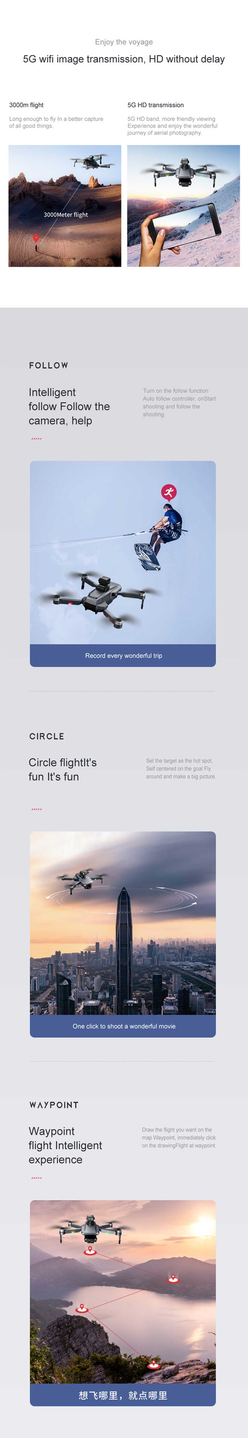 ②APP image GPS follow-up: 10-15m away from the aircraft to identify the subject and automatically follow the flight.