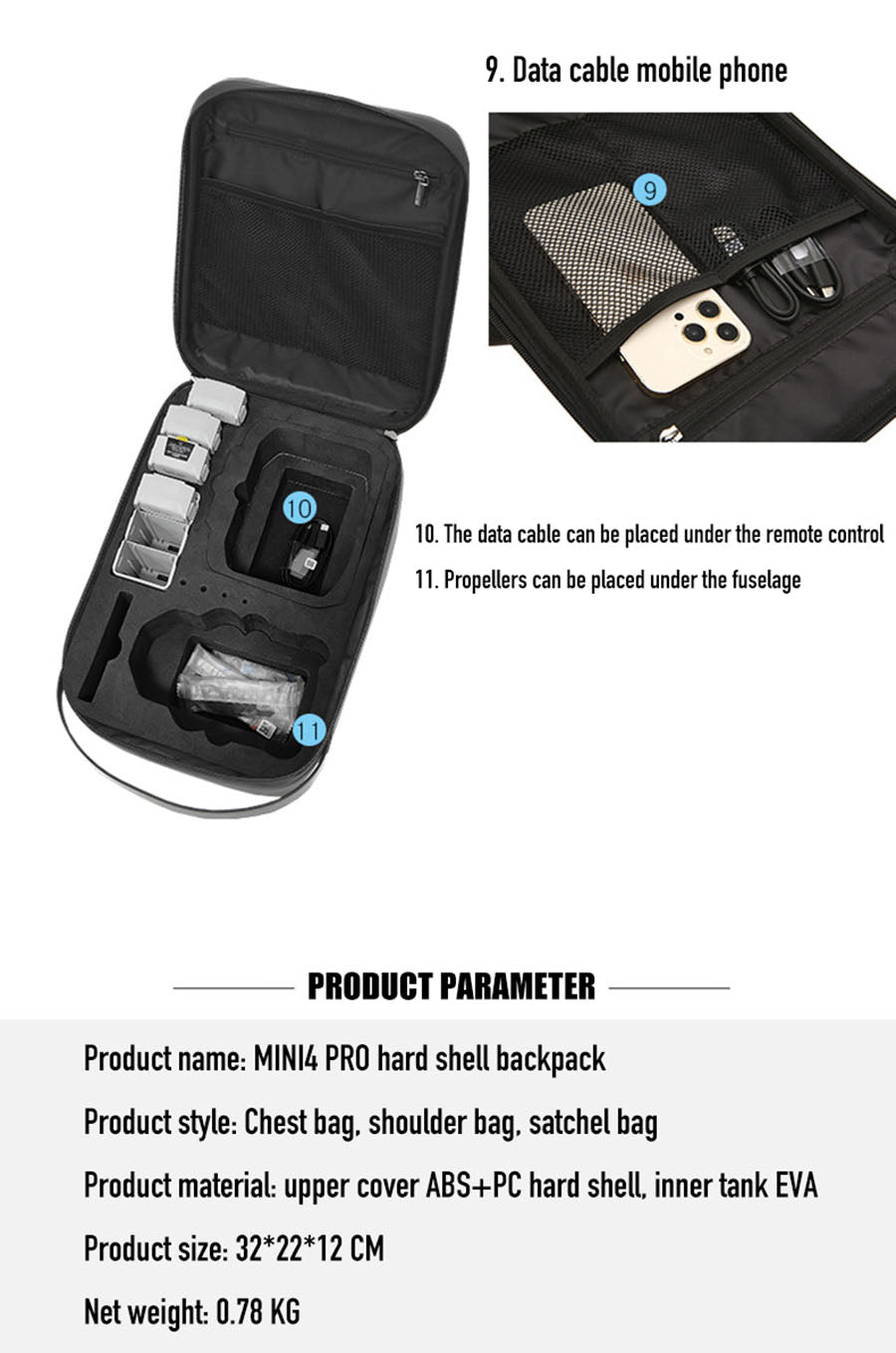 This DJI Mini4 PRO storage bag is made of high-quality, thick and durable materials. It uses an EVA liner that is harder than pearl cotton and is durable and not easily deformed. It has an ABS+PC hard shell shell, a two-way smooth metal zipper puller, and a reinforced soft handle. It has a beautiful appearance and convenience. Practicality, providing the best protection for drones.