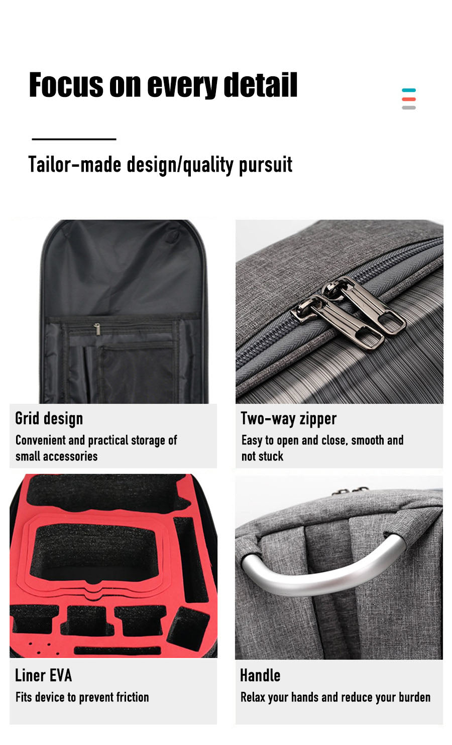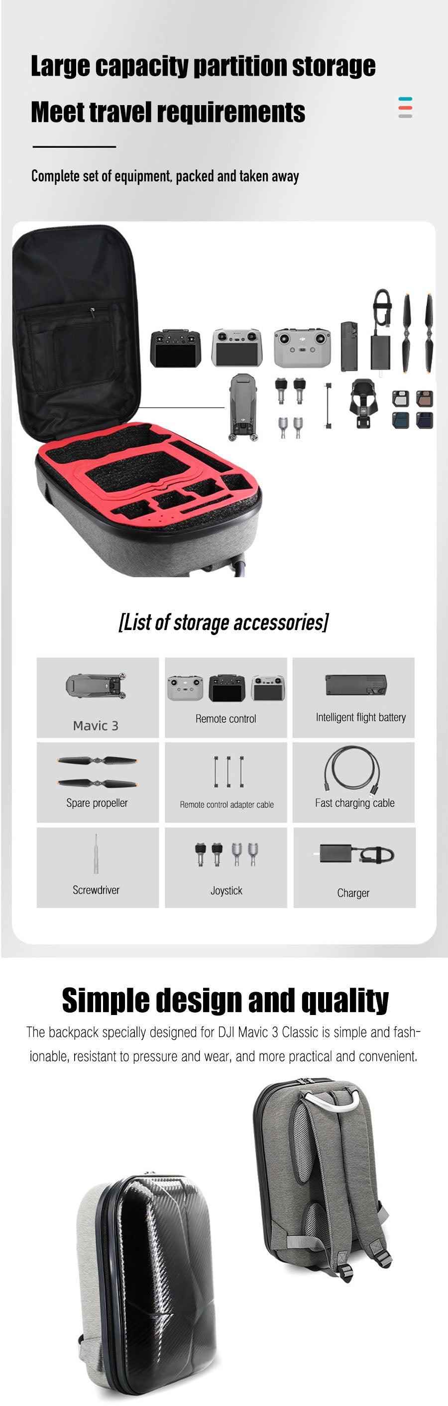 1. Simple design and quality: The backpack specially designed for DJl Mavic 3 Classic is simple and stylish, pressure-resistant and wear-resistant, more practical and convenient