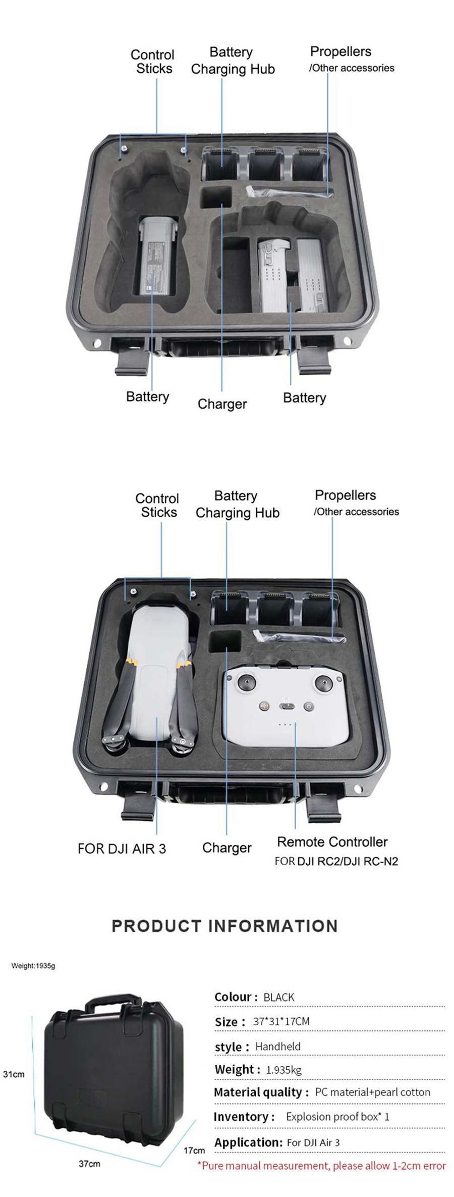 1. Simple design and quality: This DJI AIR 3 storage bag Made of ABS plastic, high-precision mold injection molding shell, sealing ring design at the junction of the upper and lower shells, anti-fall, anti-pressure, anti-impact, 1 meter waterproof