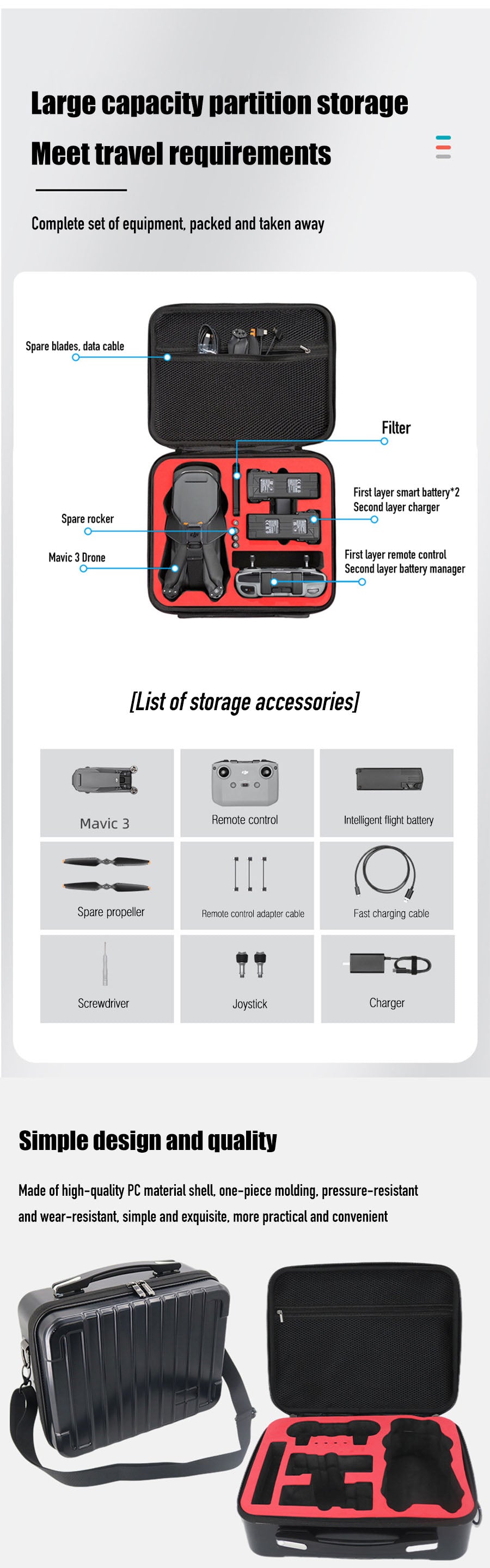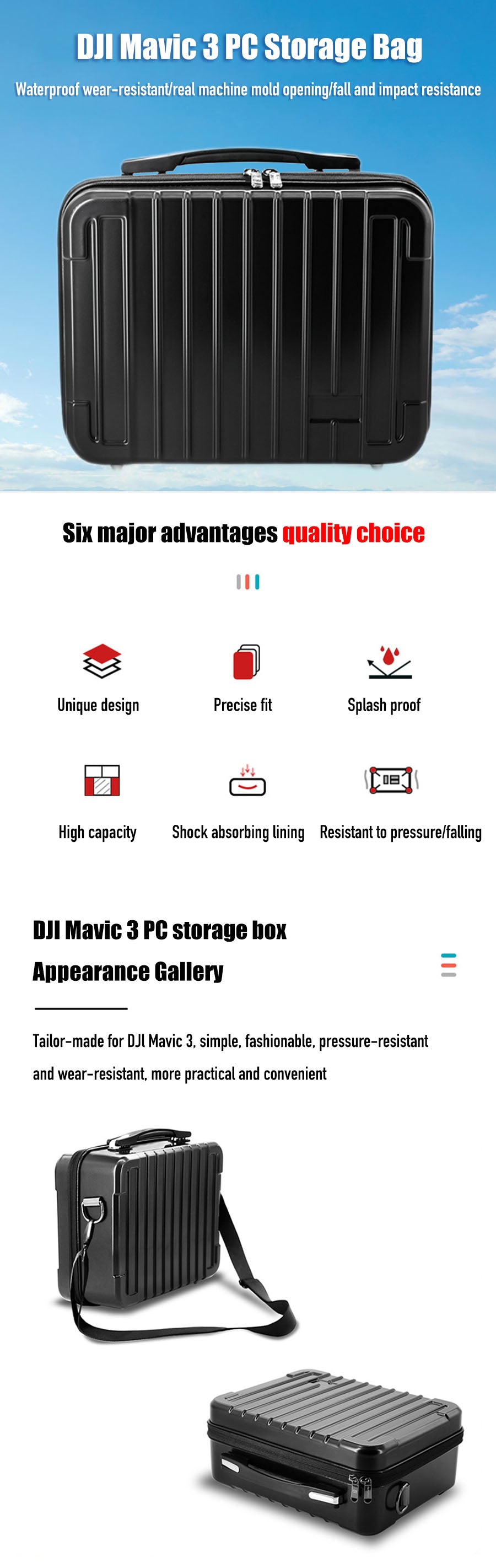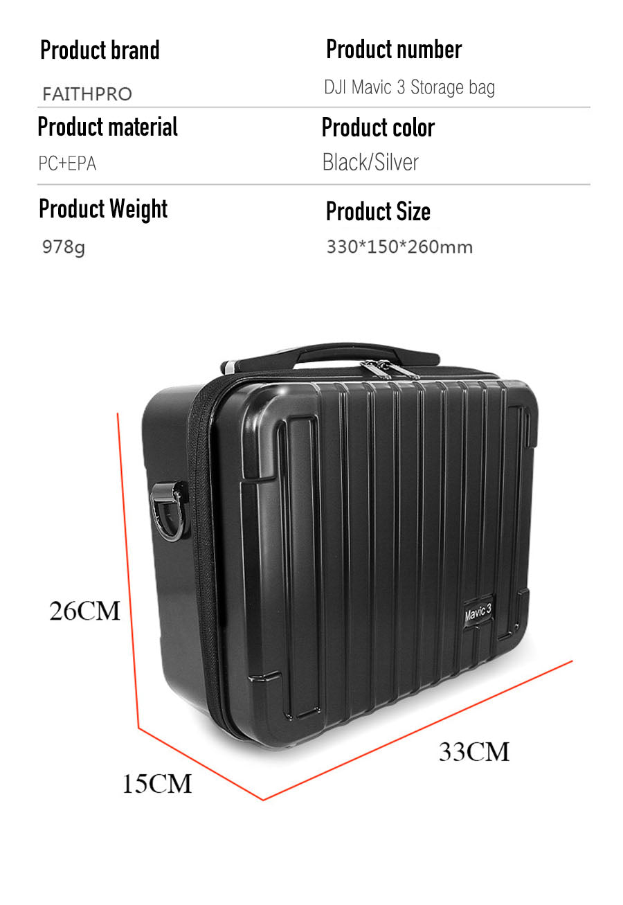 1. Simple design and quality: This DJI Mavic3 Storage bag Made of high-quality PC plastic shell, anti-collision and waterproof, one-piece molding, pressure-resistant and wear-resistant, simple and exquisite, more practical and convenient