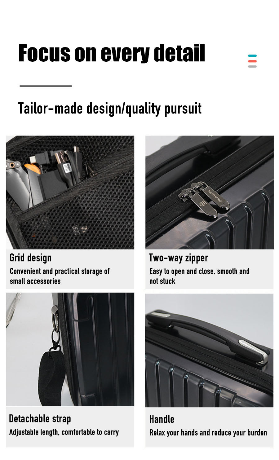 2. PC anti-splash fabric: This DJI Mavic3 Storage bag can plays a certain blocking role when exposed to water in a short period of time and is not afraid of getting the items in the bag wet.