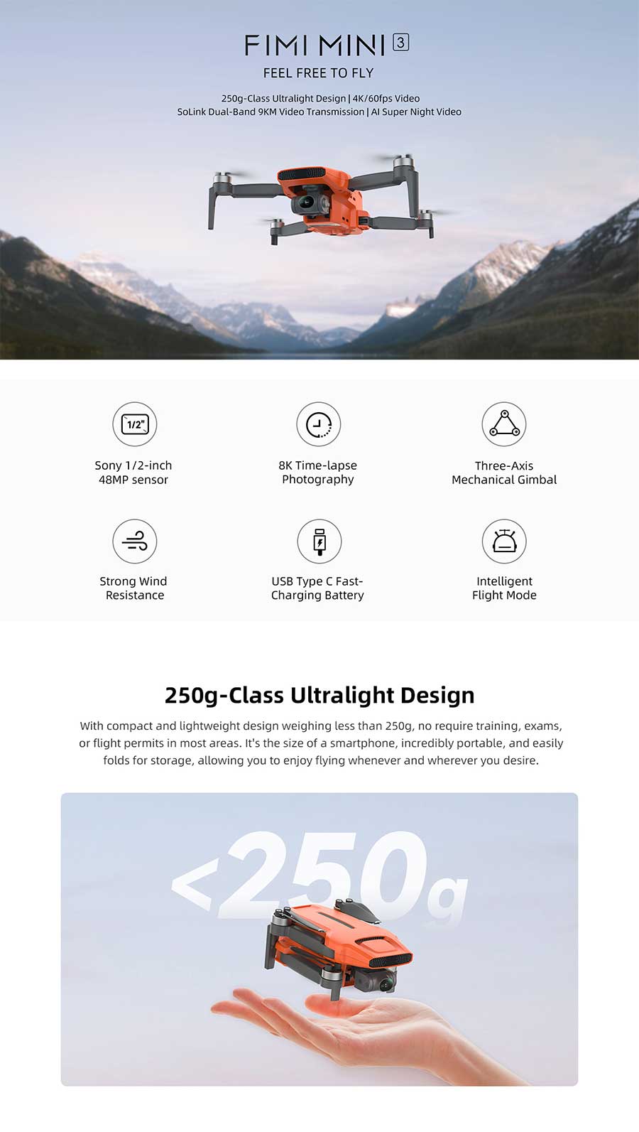 FIMI X8 MINI 3 Maximum Flight Time: 32 minutes *Measured with the aircraft flying forward at a speed of 21.6km/h irwindless conditions at sea level until the remaining battery level reaches 0%. This isfor reference only; please pay attention to app prompts during actual flight.