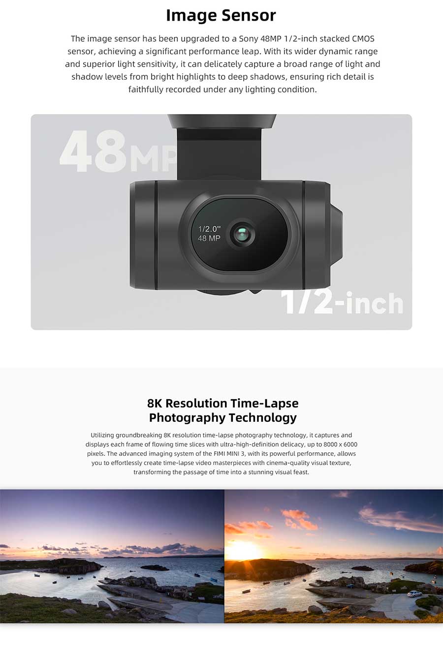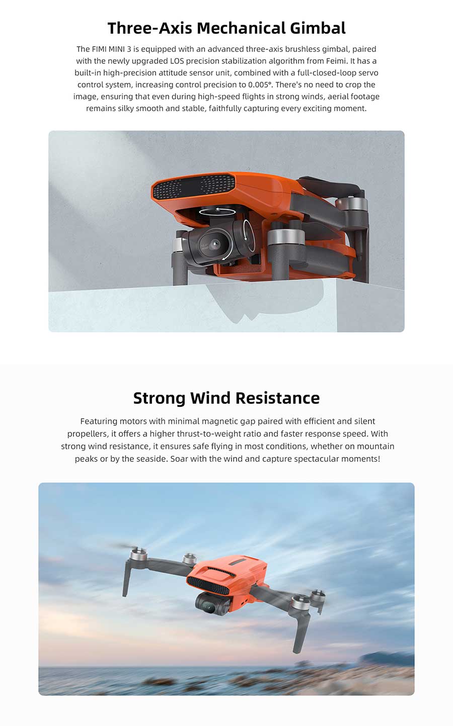 FIMI X8 MINI 3 Three-axis Mechanical Gimbal: -115°~ 40°(Pitch); -40°~ 40°(Roll); -40°~ 40°(Yaw)