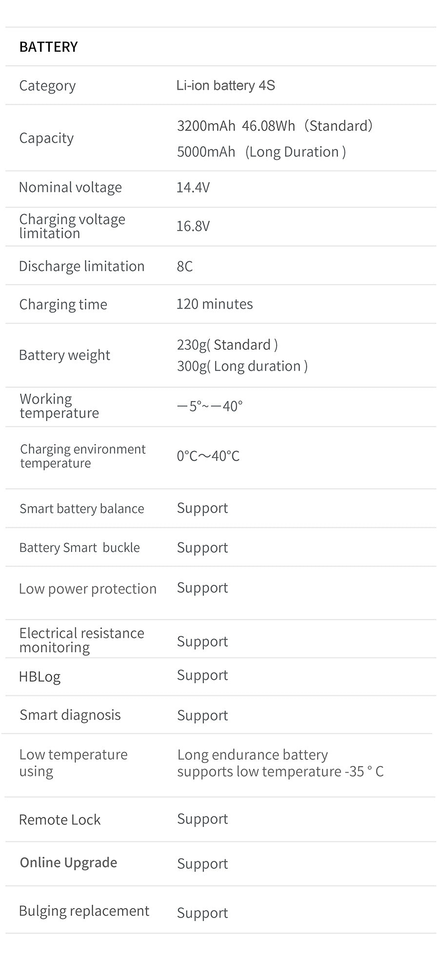 Intelligent battery: Cell balancing,Intelligent power estimation; Intelligent on-off control; Overcurrent protection; High temperature protection; Overcharge protection; Overdischarge protection; Automatic discharge, Struggling mode.
