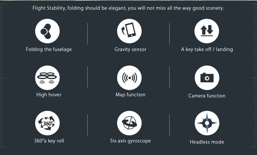 Up/down, Forward/backward, Turn left/right, Sideward flight, 3-level flight speed, LED Light, Headless Mode, One Key Automatic Return, Altitude Hold Mode, WiFi FPV