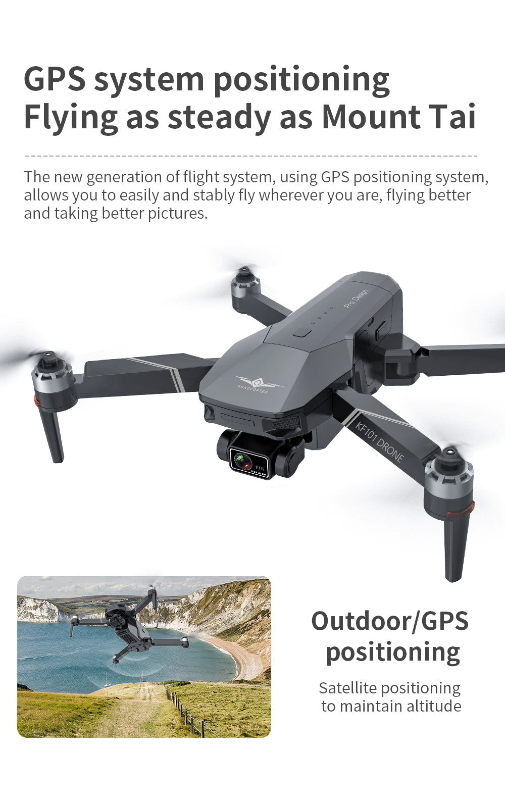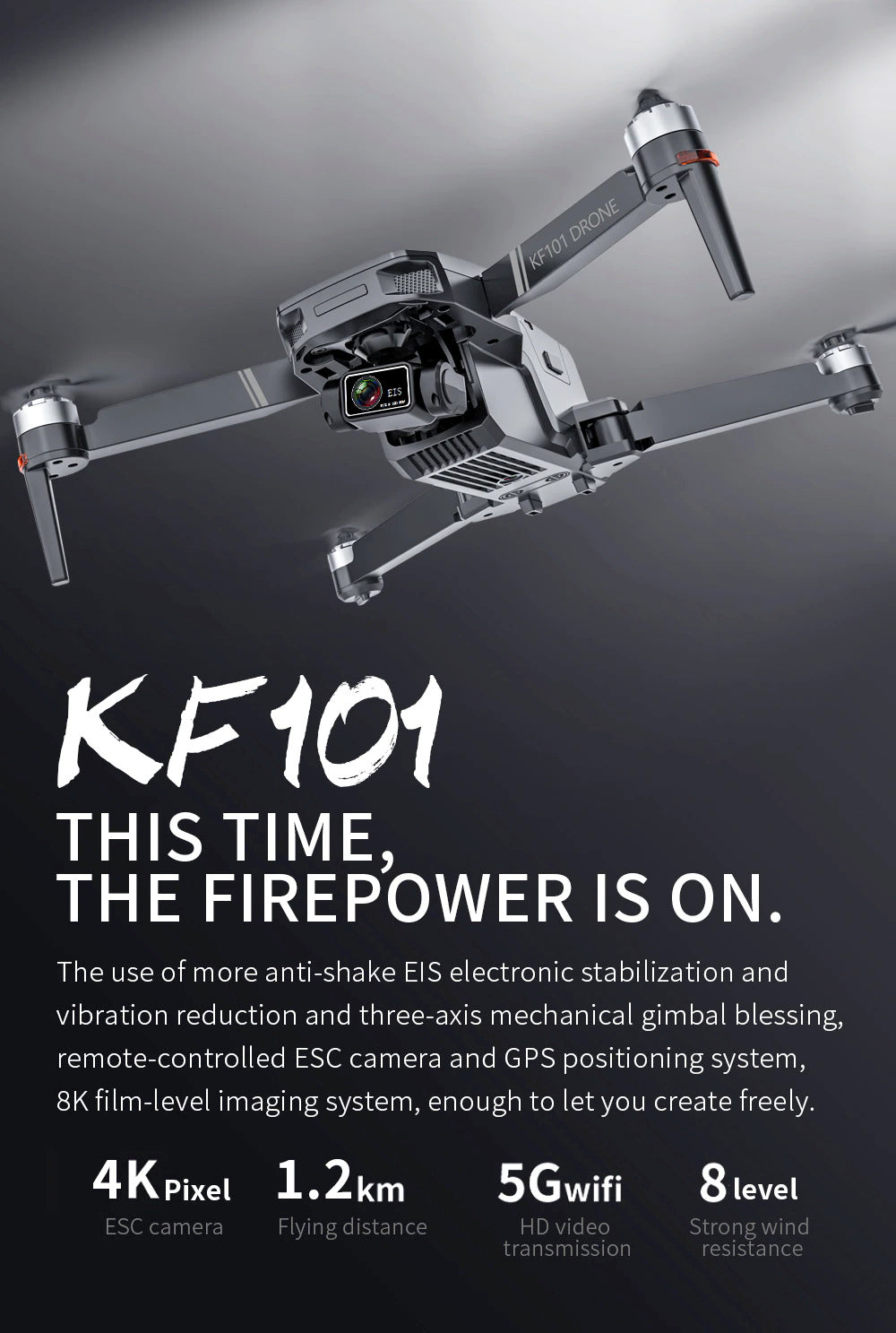KF101 GPS Assisted Intelligent Flight: Never lose the drone. It returns automatically whenever battery is low, signal is lost or you press one key return. Also, it is so smart to fly at your will, following you automatically, flying along a PA-TH you set, or fly around a point in circles. You may focus on your photography and creation.