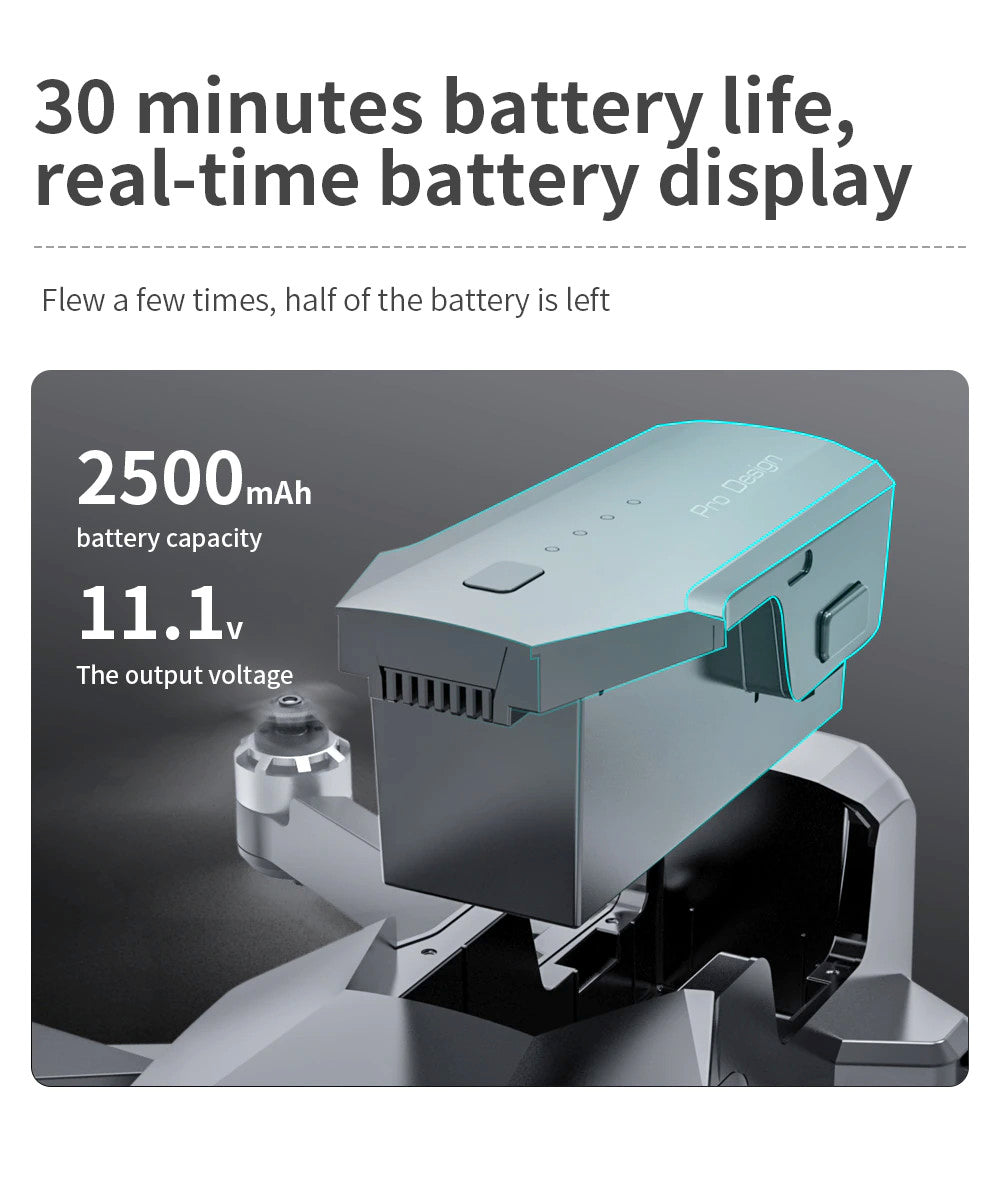 KF101 Configuration Upgrade: The intelligent battery works for 25 Mins for each charge; the long-life Brushless Motors have lower power consumption and give you a quieter flight the foldable design and well-fitted carrying case make it easy to take the drone outdoor.