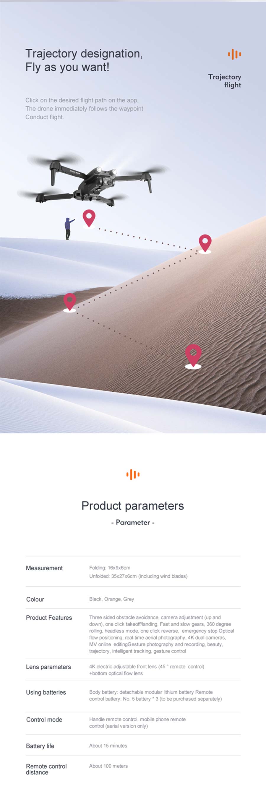 2. Image following: 1-3m away from the aircraft to identify the subject and automatically follow the flight.